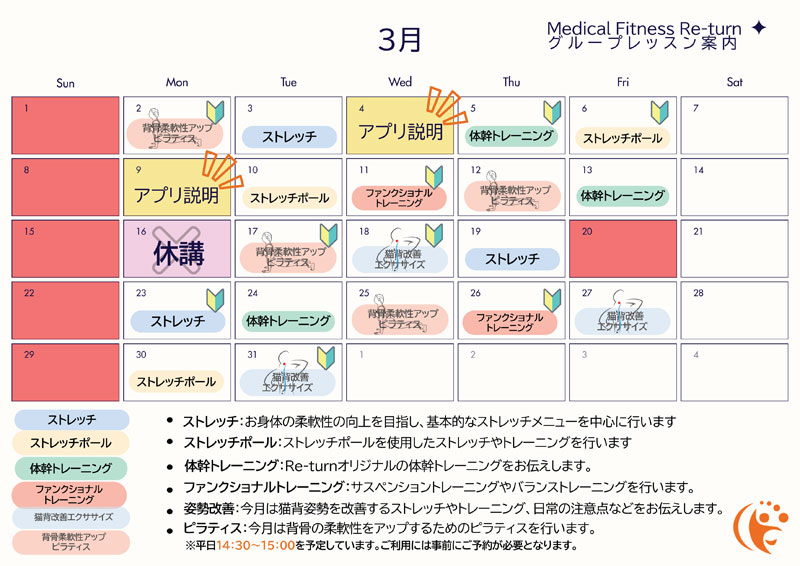 3月のグループレッスンスケジュールが完成しました。
